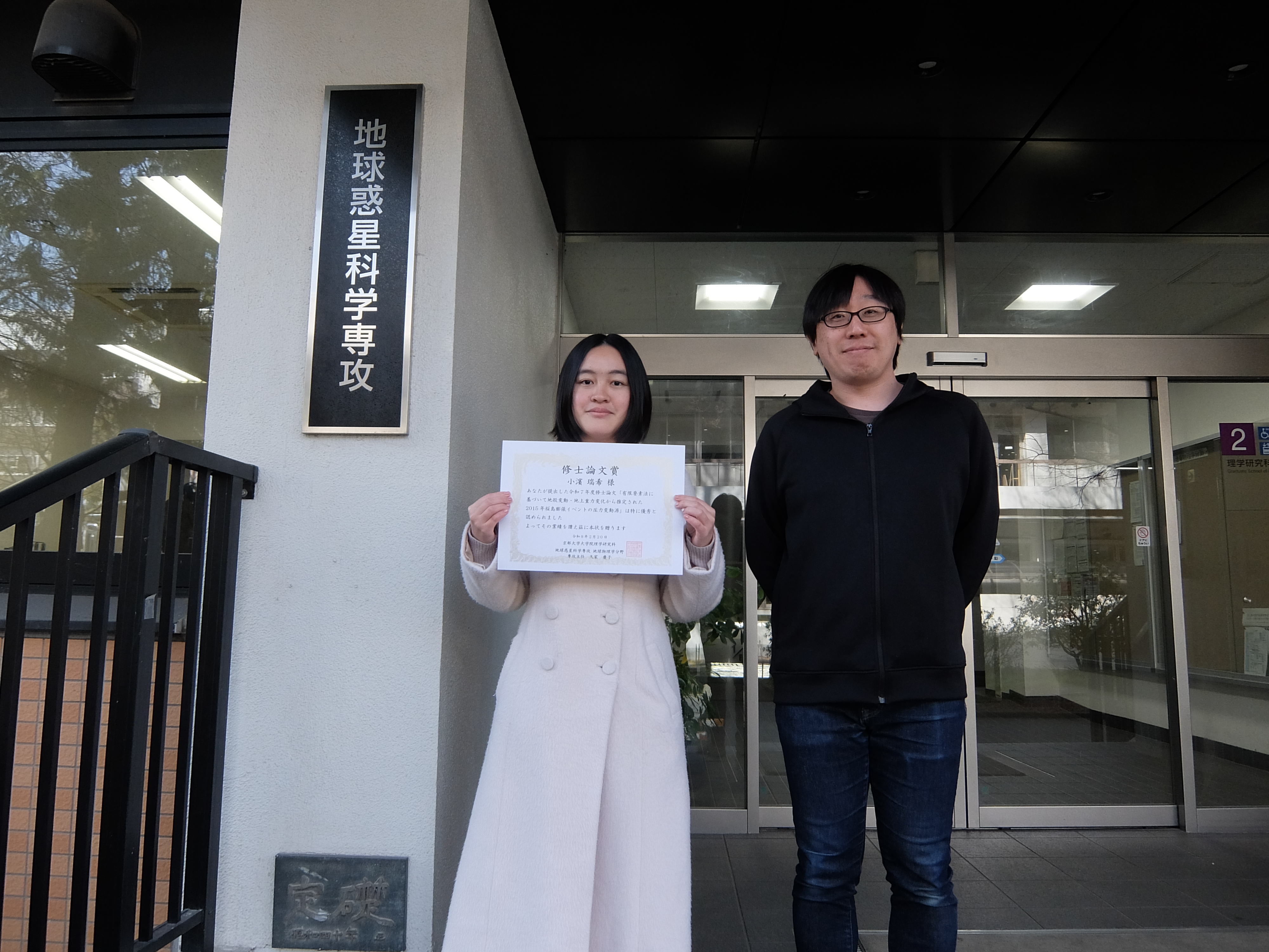 この度は修士論文賞をいただき、大変光栄に思います。指導教員である風間卓仁助教をはじめ、これまで助言をくださった皆様に深く御礼申し上げます。本研究では、2015年8月15日に桜島で発生した山体膨張イベントを対象として、地殻変動と地上重力変化をモデリングすることで地下に貫入したマグマ密度を推定しました。研究を進めていく中で、限られたデータから正確にマグマ密度を推定できるのかという不安が常にありました。しかし、新たな計算手法を開発したりモデリング方法に創育工夫を凝らしたりすることで、最終的には密度推定がうまくいきました。地上で観測されたデータから地下の状態を把握することに学部生のころからあこがれていたため、それを達成できて本当に嬉しかったです。このような成果を挙げることができたのは、助言をくださった周囲の方々だけでなく、日々桜島の火山活動を監視されている皆様のおかげでもあると強く感じています。お世話になったすべての皆様に感謝申し上げるとともに、この経験を糧にして今後も精進していきたいと思います。