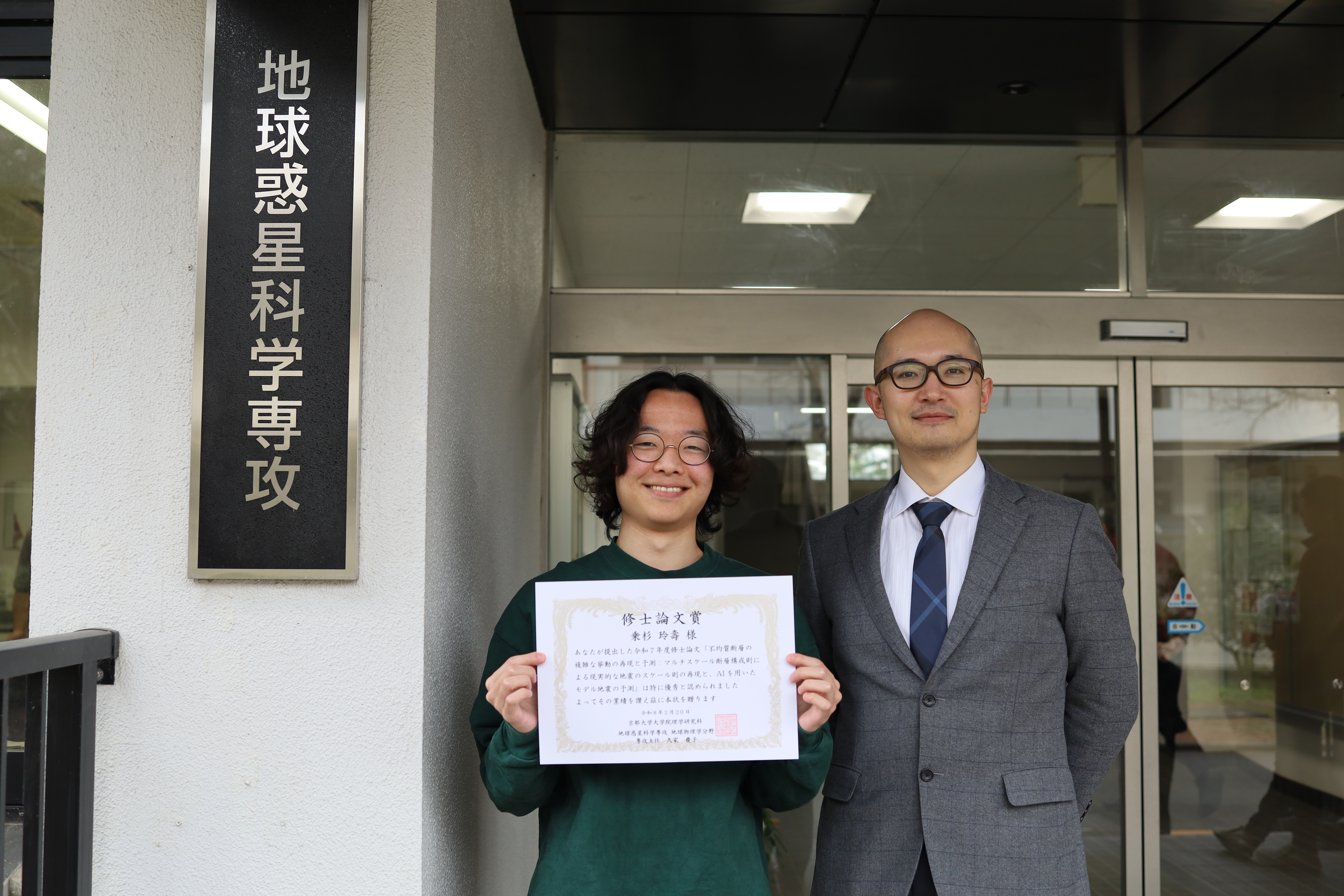 この度は修士論文賞を頂き、大変嬉しく思っております。このような評価を頂ける研究ができたのは、第一に指導教員である野田博之准教授の丁寧なご指導の賜物です。また、地震予知研究センターの先生方や学生、職員の方々には日頃から大変お世話になり、感謝の念が絶えません。修士課程で様々な経験をさせて頂いた身として、伝えておきたい後輩へのアドバイスが、「自分の研究発表についての感想を色々な人から聞く」ということです。先生方や学生の方々からそのような感想をいただく機会が多く、短時間の発表で研究内容を伝えることの難しさを知りました。試行錯誤するうちに、本当はたくさんある伝えたいことを、なるべく絞って簡潔にした方がかえって研究の面白さが伝わりやすいことに気付きました。大学院という、どんどんとフィードバックを受けられる恵まれた環境だからこそ、恥を捨てて色んな人の意見を聞くのが成長への近道だと感じた次第です。