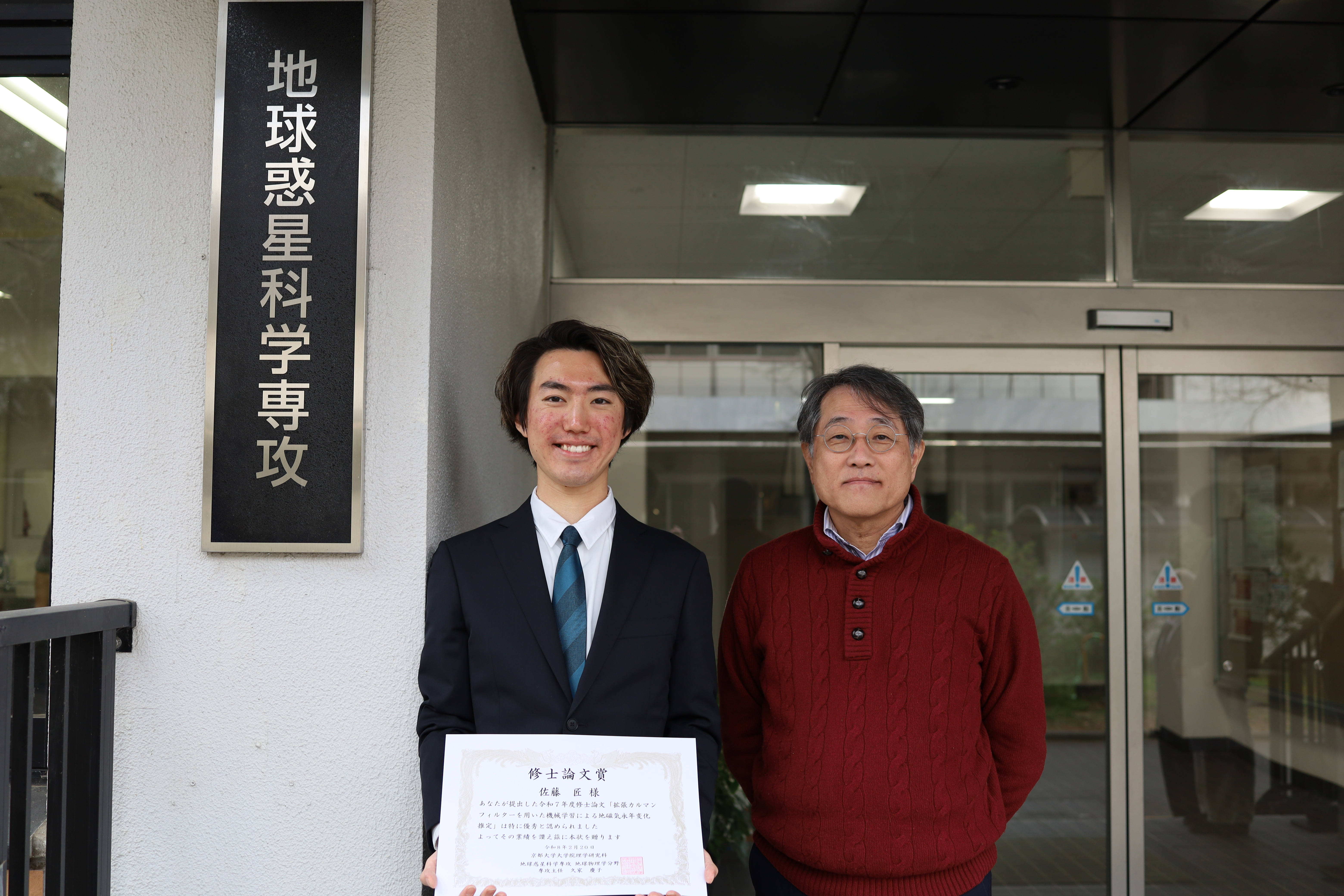 この度は修士論文賞をいただき、大変光栄に思います。ご指導くださった藤先生をはじめ、切磋琢磨し合える環境を支えてくださった研究室の皆様に心より感謝申し上げます。 本研究では、機械学習と物理を融合させた地球磁場の予測手法の開発に挑みました。手法の構築から論文執筆に至るまで、思い通りにいかないことの連続でしたが、国際プロジェクトでの共同作業や学会での対話を通じて、一つずつ課題をクリアしていくプロセスにやりがいを感じました。独学での実装やデータ解析など、地道な試行錯誤を重ねて成果を形にできたことは、非常に貴重な経験となりました。 4月からは新しい環境に身を置きますが、研究室で培った姿勢を大切に社会に貢献していく所存です。2年間、温かいご支援をいただき、誠にありがとうございました。