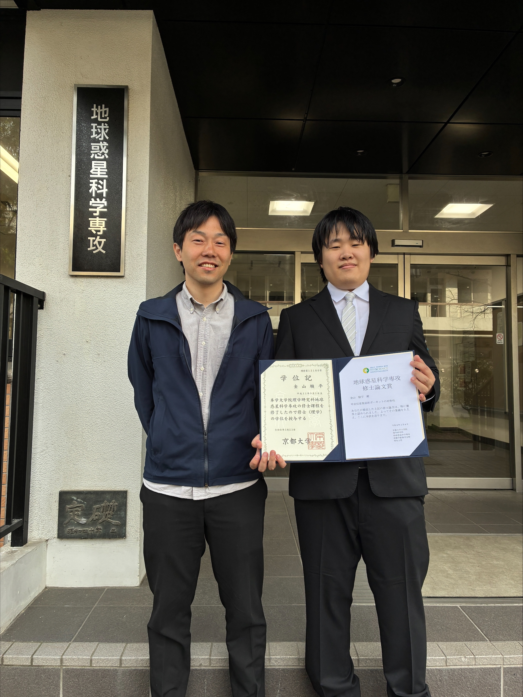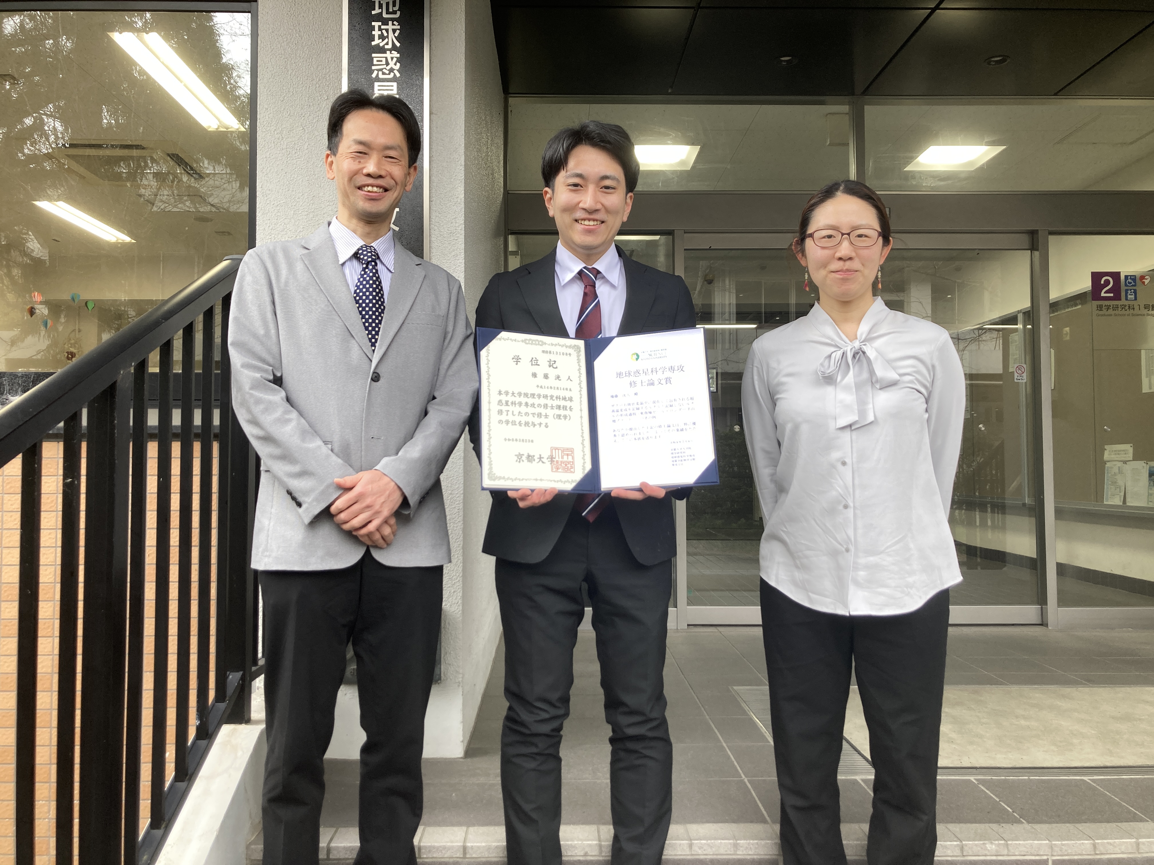 この度は、修士論文賞を頂き、大変嬉しく思っております。本研究がこのような評価を頂けたのも、指導教員の土`山明教授や瀧川晶特定教授の熱心なご指導と、学内外を問わず、たくさんの先生方や研究員の方々、学生の皆様からのご支援があってのことです。お世話になった皆様に厚く御礼申し上げます。小惑星探査機はやぶさが地球に帰還して話題となった2010年当時、私はまだ高校生で、隕石だけでは飽き足らず、「生」の石を宇宙から持ち帰ろうとした研究者の情熱に感銘を受けました。縁あって、その中でも最前線でご活躍されてきた土`山明教授のもとで研究ができることになり、当時テレビ越しに感じた「研究者魂」を身近に感じながら、自らの見聞を広めることができました。また、ほんの少しですが、高校生の時に憧れたこの分野に携わることができたことは、私にとってかけがえのない財産です。本学での経験を糧にして、これからも精進して参ります。